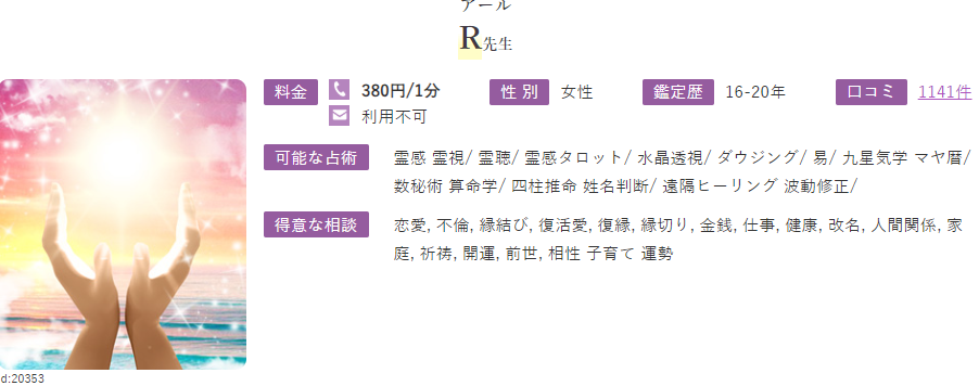 使用占術霊感・霊視/霊聴/縁結び/ソウルメイト/過去視/未来予知/前世/来世/思想伝達/想念伝達/遠隔ヒーリング/波動修正/スピリチュアルリーディング/エネルギー調整/インナーチャイルド