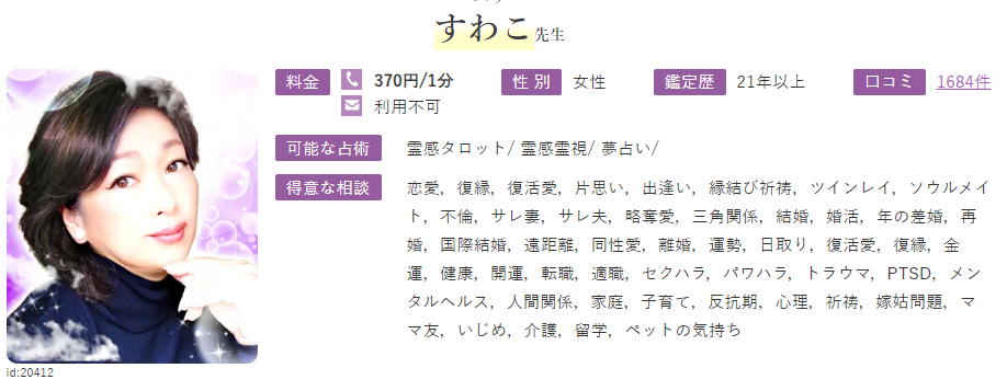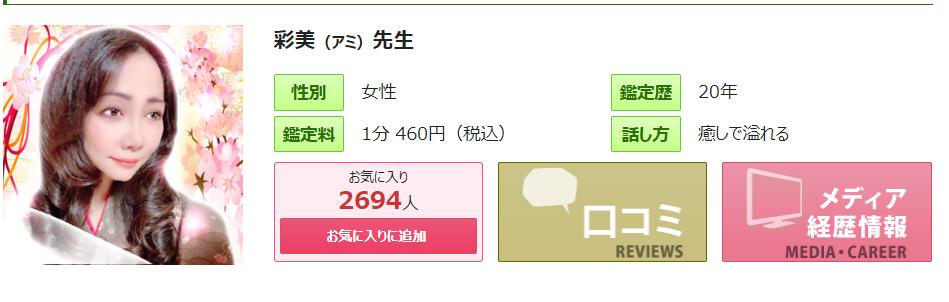 得意な相談内容恋愛成就/復縁/結婚/不倫・複雑愛/仕事・適職/人生相談