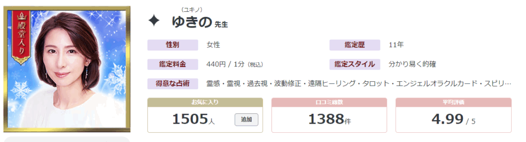 ゆきの先生は、電話占いリノアで高いリピート率を誇る霊視系の鑑定師。