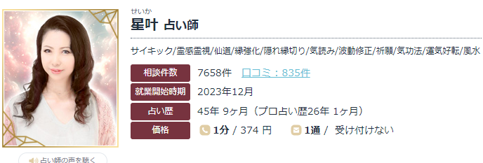 星叶(せいか)先生は、45年以上にわたる鑑定歴を持つ実力派のスピリチュアルカウンセラーです。