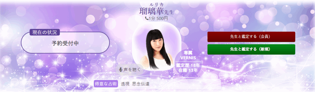 瑠璃華先生は、透視力に優れた電話占いヴェルニの実力派占い師。