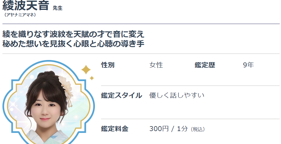 幼いころから人の気持ちを直感的に感じ取る能力に恵まれ、その力を生かして、霊視やチャネリングを通じた心の声の通訳のような鑑定を行っています。